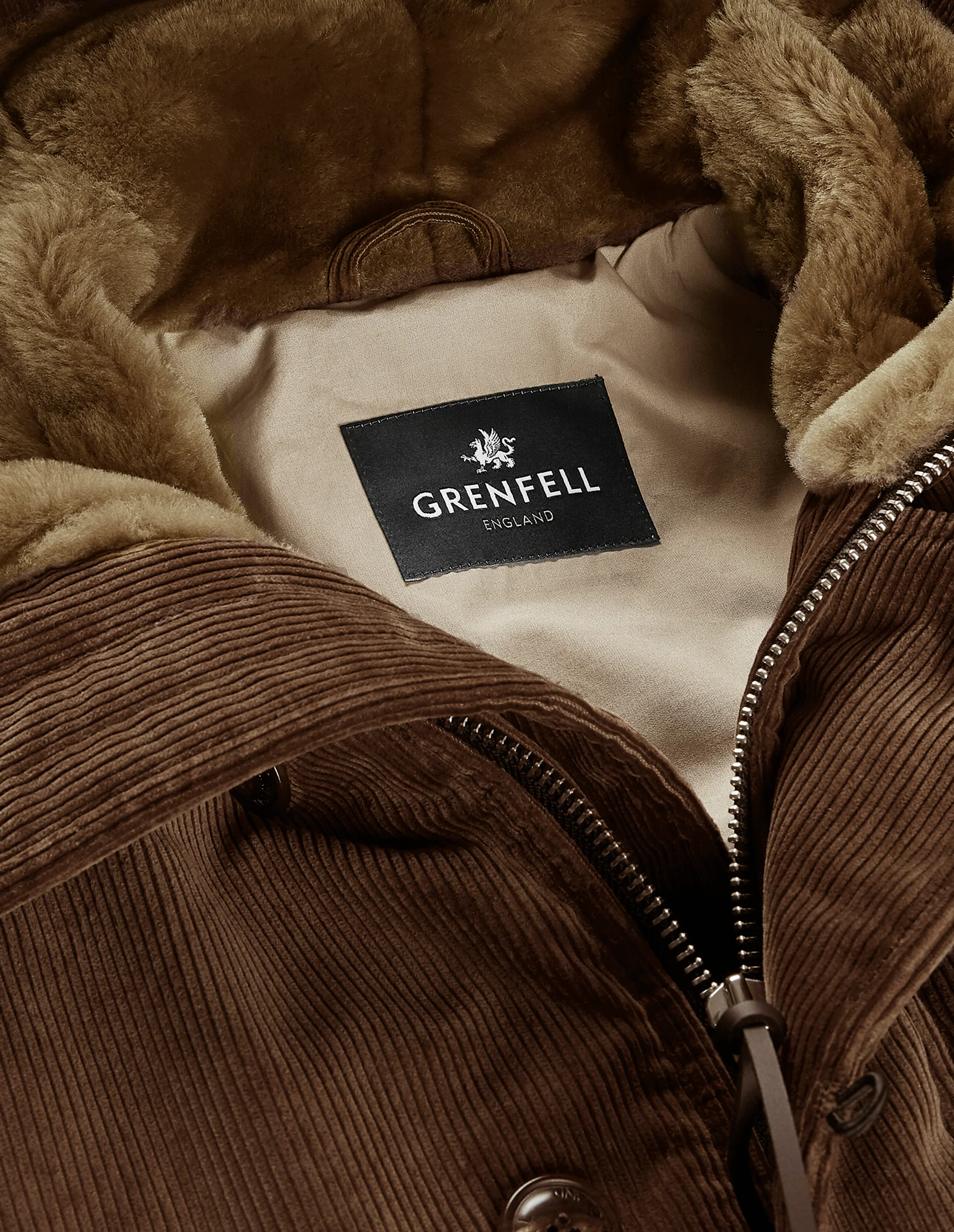 Inspired by archive Grenfell Parka jackets used on expeditions over the past century, the Labrador Parka Jacket is executed in a British corduroy and fully insulated using Primaloft technology. The jacket is trimmed at the cuffs with real Shearling and also features a shearling hood lining. It features two lower pockets and two chest hand warmer pockets. The hood features a faux coyote, detachable fur trim. The perfect high season piece to keep you warm.